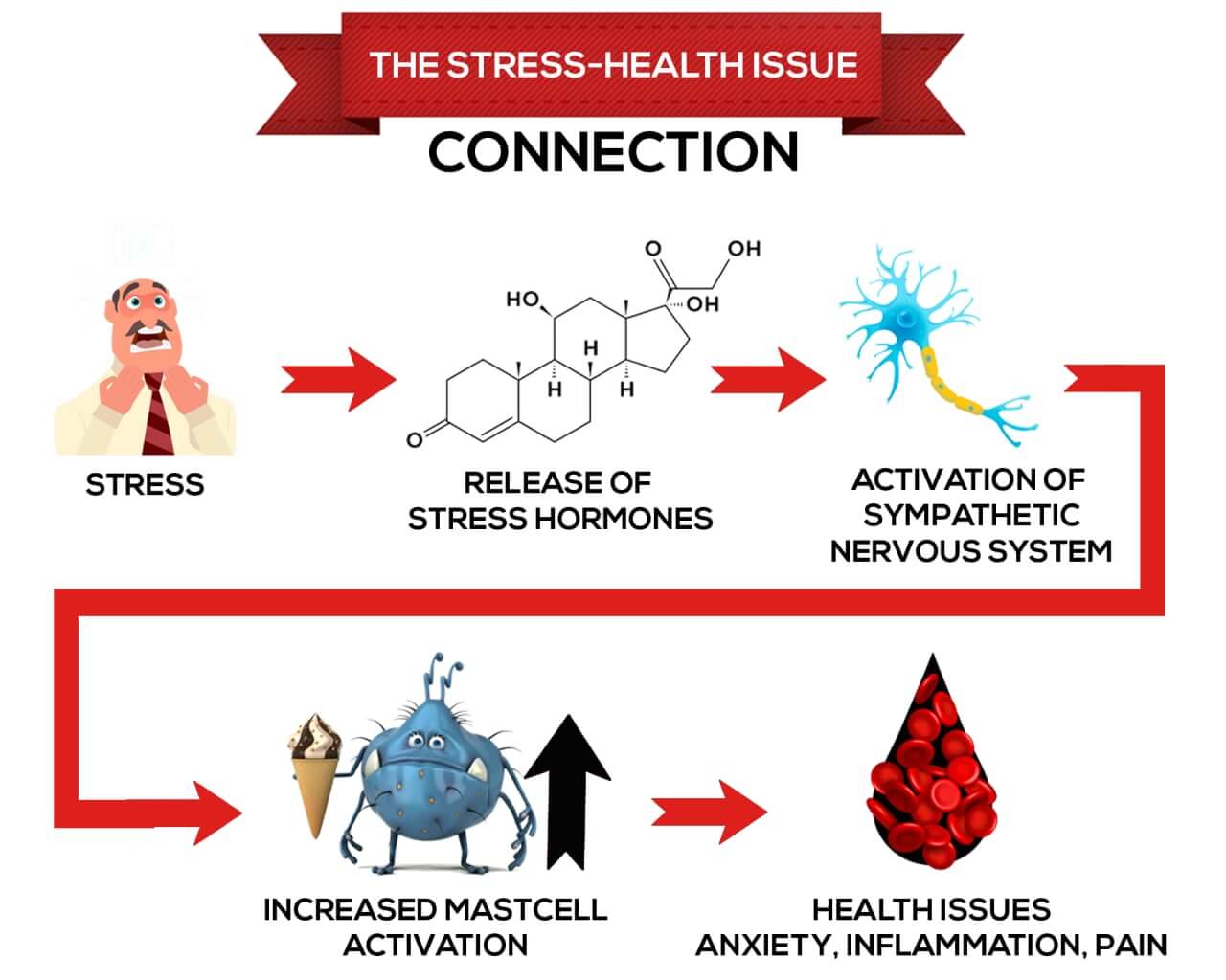 When the sympathetic nervous system is activated, the body is ready to fight or flight. Here adrenaline is released, our blood pressure increases, we get a higher heart rate and increased mast cell activation etc.