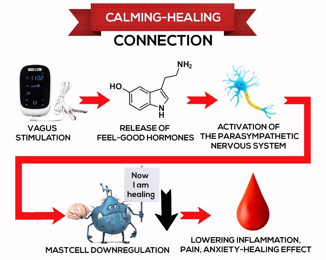 • The Vagus-Stim device uses low-intensity microcurrent, specially designed to stimulate the limbic system of the brain and the vagus nerve.• The Vagus-Stim device helps you to be more in a parasympathetic state of relaxation and calmness than in a sympathetic state where the body is in fight and flight.